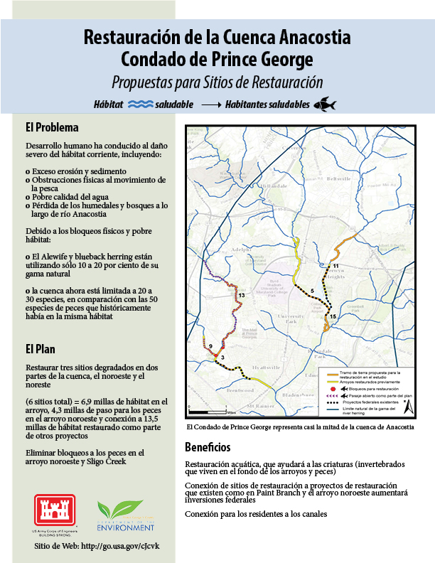 El Condado de Prince George es el patrocinador no federal para este proyecto de restauración del hábitat acuático. El Distrito de Baltimore de El Cuerpo de Ingenieros del Ejército de los Estados Unidos, y el Condado han dividido uniformemente los costos del estudio de $1,8 millones.