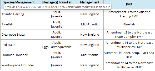 ENDANGERED SPECIES: The Corps has performed an initial review of the application, the United States Fish and Wildlife Service Information for Planning and Consultation, National Marine Fisheries Service (NMFS) Greater Atlantic Region Fisheries Office Section 7 Mapper, and the NMFS Critical Habitat Mapper to determine if any threatened, endangered, proposed, or candidate species, as well as the proposed and final designated critical habitat may occur within the boundary of the proposed project. Based on this initial review, the Corps has made a preliminary determination that the proposed project may affect species and critical habitat listed in Table 1. No other Endangered Species Act (ESA)-listed species or critical habitat will be affected by the proposed action.